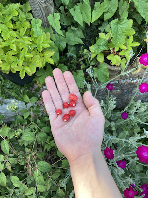 Tiny alpine strawberries, and a sweet little poppy which appeared from nowhere by our garden fence: